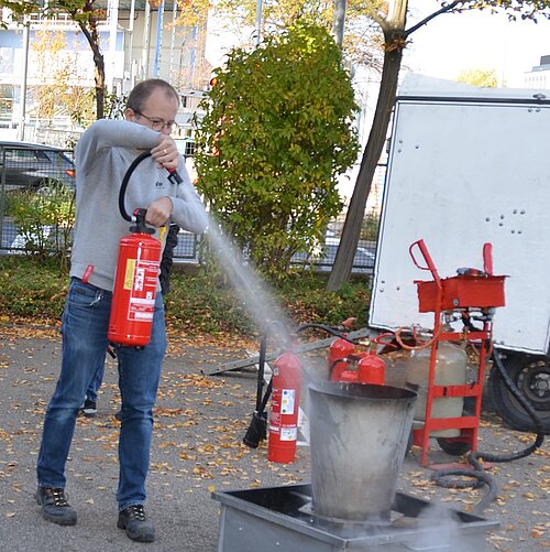 Kann er natürlich nicht. Doch weil Sicherheit uns am Herzen liegt, führen wir in regelmäßigen Abständen Brandschutzübungen durch. Zuletzt wurden zwölf Mitarbeiter mit den Grundlagen des Brandschutzes vertraut gemacht. Sie durften selbst Feuer löschen, um im Ernstfall zu wissen, wie Hand anzulegen ist. So kann größerer Schaden verhindert werden, bis die Profi-Feuerwehr eintrifft.